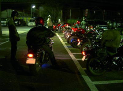 | 国道246号を走行中エリミ125を見かけて、 皆でぞろぞろ近づいていったり〜(爆) 環状8号線を越えて途中不思議なルートを進み〜(笑) 奇麗な桜を眺めつつ、多摩堤通に到着しました。 (しかしなぜ、あの不思議な道で着いたのでしょうか?) そしてナップス世田谷店にて白りんごさんと合流。 レストルームでしばらく(かなりかな?w)休んだ後、 お店に入り商品を眺めてきました。 こうして。。。 すっかりあたりは暗くなりまして 夕食でもという話に。 (あ。。。花見に行くという話はすっかり忘れていました。 でもナップスまでの道すがら眺められたし良いかなw) 白りんごさんはここでお別れということになりました。 移動に際してエンジンをかけると 皆のエリミVの随処で光りが点灯☆ 各自ネオン管やLED、フラッシュ等光り物多数ですね〜。 特に目に付くのは青い光♪ これってもう定番になりつつあるのかな? |